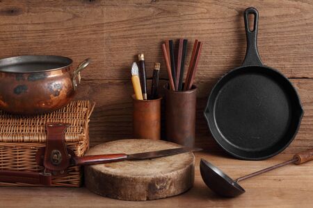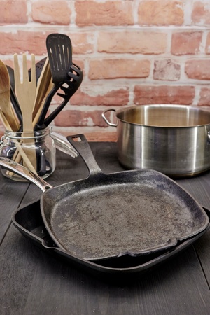 Empty black cast-iron frying pan with vintage kitchen items on a brown table, top view, vintage toning