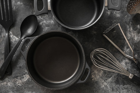 Cooking pots and kitchen utensils on dark grunge background