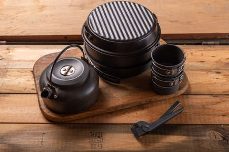 Tourist cookware for cooking food on fire. Set of dishes. Top.