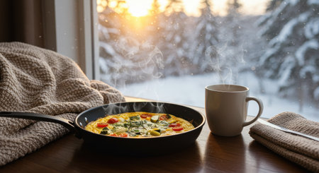 Frying pan omelet with vegetables, cup of coffee, and winter forest view through the window. Cozy winter breakfast scene on wooden table.