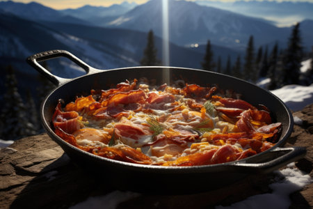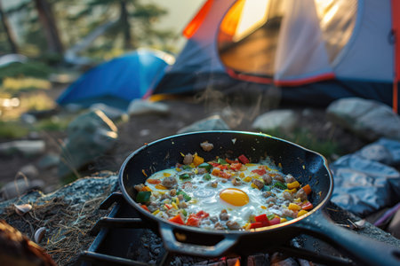 Gourmet Camping Breakfast, skillet of eggs, veggies, and sausage, campsite morning, hearty and rustic, tent and pine trees out of focus, overhead shot of skillet on camp stove, early morning soft light, 24mm lens --ar 3:2 --v 6 Job ID: e3bf36ff-8624-45d4-ac47-3846f9e9bd8e