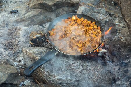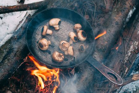 Fried mushrooms in a pan in the forest. Fried food in nature. Picnic in the winter forest. Cooking on an open fire. Champignon on a fire.