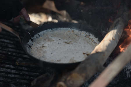 Homemade macaroni in a cast-iron frying pan on the bonfire