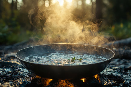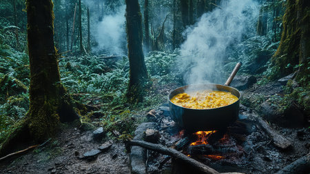 A captivating scene of outdoor cooking featuring a large pot on a campfire surrounded by lush greenery, capturing the essence of wilderness and tranquility.