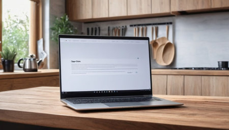 Open laptop with blank screen on a wooden desk in a kitchen room home office