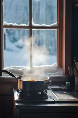 Cozy kitchen scene with steaming pot on the stove beside snow-covered window during winter morning