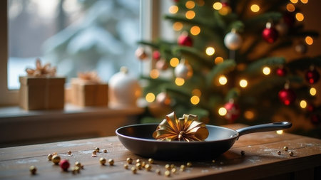 A black skillet with a golden bow sits on a wooden table in front of a twinkling Christmas tree. The tree is decorated with red and white ornaments and white lights.