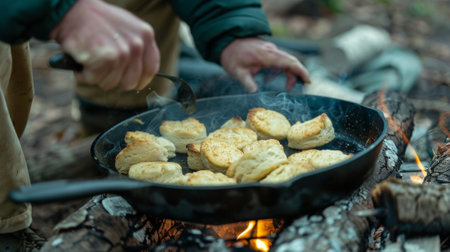 A campsite cook prepares a batch of biscuits from scratch using a camp stove and cast iron pan