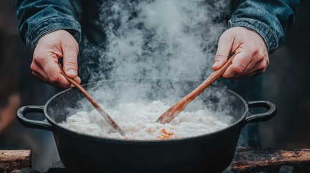 A person stirs rice in a black pot outdoors, surrounded by steam and smoke, creating a warm and inviting scene that showcases the joy of cooking in nature.