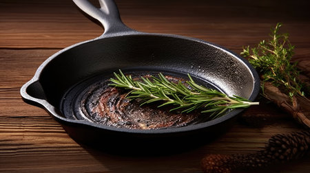 simple, rustic flatlay with wooden spoon and cast-iron skillet, created with generative ai