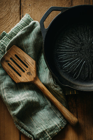 Cast iron pan wooden spatula green kitchen towel rustic cooking tool flatlay