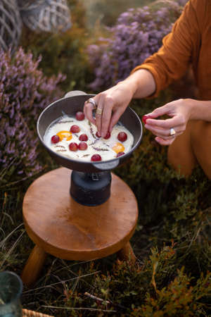 Woman traveler prepares breakfast, frying eggs and grapes on a burner while traveling in mountains on foggy weather
