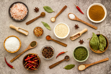 Various spices spoons on stone table