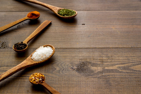 Wooden spoons with paprika, turmeric, herbs and pepper