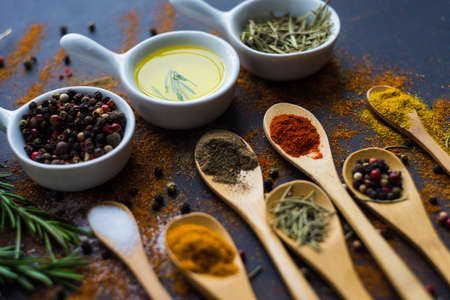 Colorful various herbs and spices for cooking on dark wooden rustic background