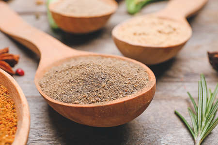 various spices in spoons on a wooden table. Selective focus