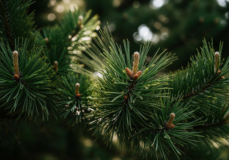 Detailed macro view of fresh, dark green pine needles and emerging candle buds on a conifer branch, perfect for nature, winter, or holiday backgrounds.