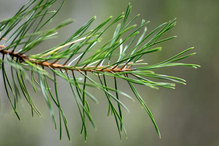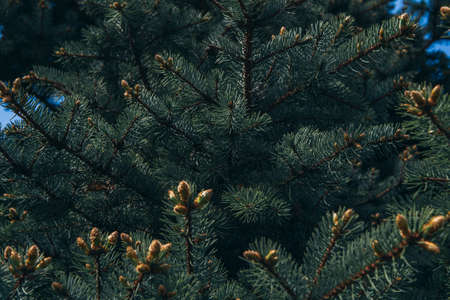 Macro shot of green spruce needles, close up, blurred background, copy space