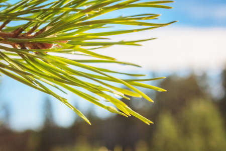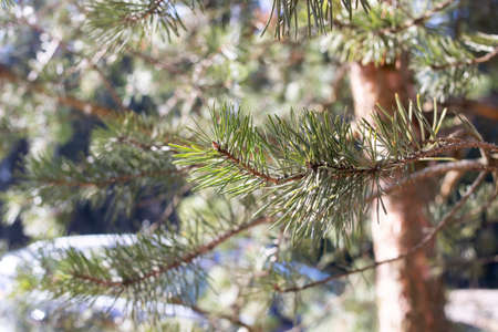 Spruce or pine branch, close-up, blurred background. Green needles of a taiga tree in the sunlight. Christmas tree