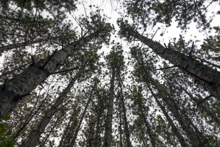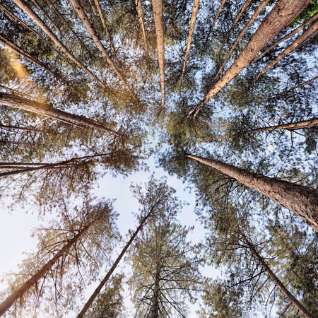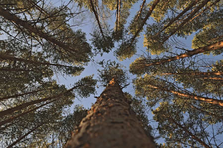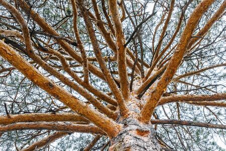 Unusual view of big old pine tree, from bottom to top, summer scene