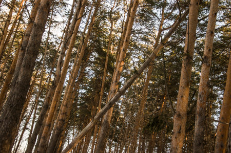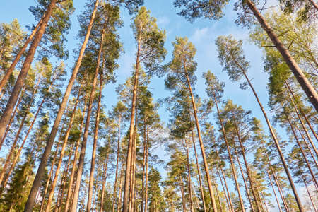 Majestic northern evergreen forest. Mighty pine trees. Low angle view. Soft sunlight, clear blue sky. Atmospheric landscape. Nature, environment, eco tourism, fresh air concept