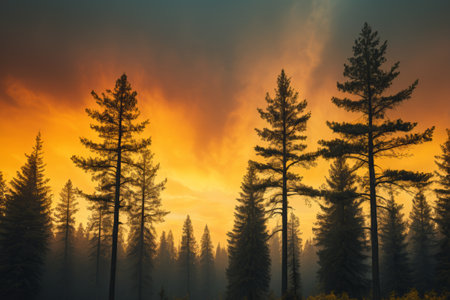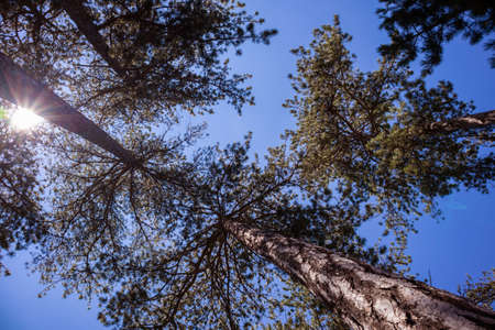 Bottom view of tall pine trees and sun in the evergreen forest of Zlatibor nature reserve, Serbia, Europe. Blue sky in the background.