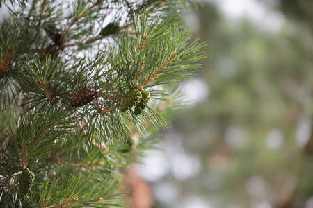 Pine branch with a cone. Close-up of pine needles and a young cone. Natural background. Juicy green needles.