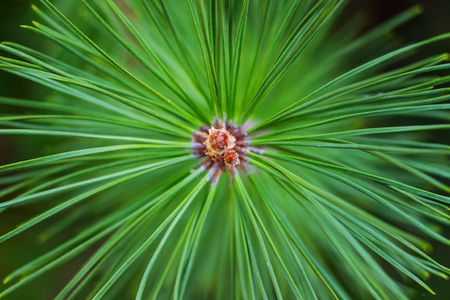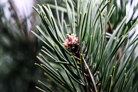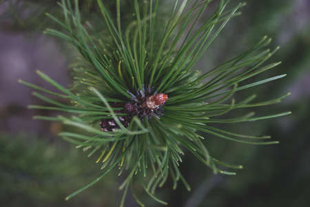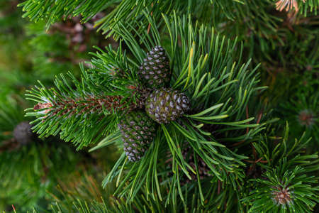 Macrophotography of mountain pine (Pinus mugo). European Elfin pine