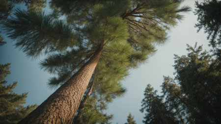 Captured from below, this stunning image showcases a towering tree against a clear sky, highlighting its strength, beauty, and the vibrant greens of nature.