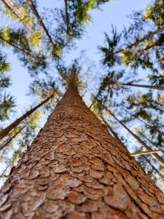 Worm's eye view of a tall pine tree with textured bark, its branches extending towards a vibrant blue sky, creating a sense of awe and tranquility