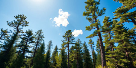 Vibrant forest landscape featuring tall pine trees reaching towards a sunny blue sky filled with fluffy clouds, perfect for outdoor themes.