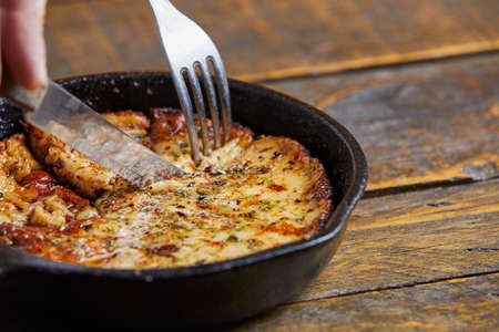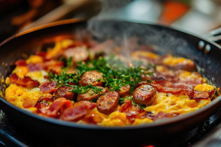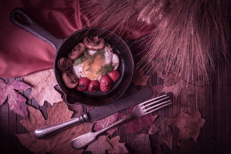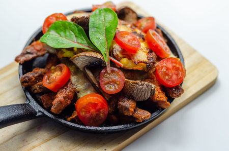 fried eggs in a frying pan, with cheese and chicken, stylish serving of dishes in a cafe and restaurant