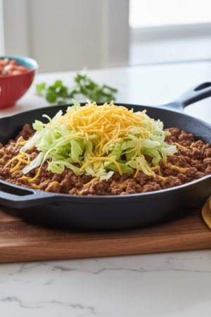 A skillet filled with ground beef is topped with shredded cheese and lettuce, placed on a counter with tortillas and dips nearby. Bowls of salsa and guacamole are in the background. The meal setup is warm and inviting.