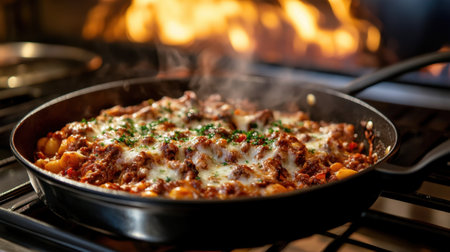 Experience the warmth of home cooking with this delicious casserole bubbling with melted cheese and fresh herbs, creating a comforting ambiance in the kitchen.