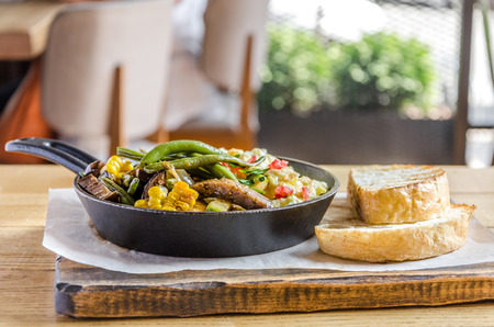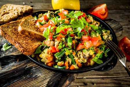 Mexican Southwestern Egg Scramble, Simple healthy breakfast idea with eggs and vegetables, with toast. Wooden background copy space