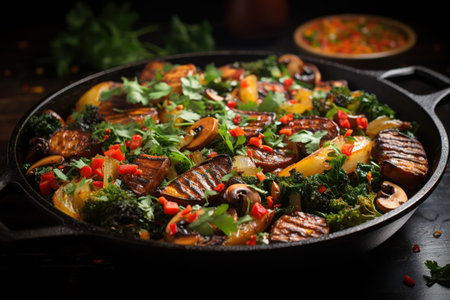 vegetable stir fry with broccali, red peppers, mushrooms on a cast iron skillet Generative AI
