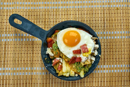 Homemade food, fried potatoes in a pan with tomatoes and eggs.