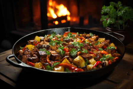 Frontal meal view of cooked vegetables with sliced ??meat and peppers in a pan on , generative AI