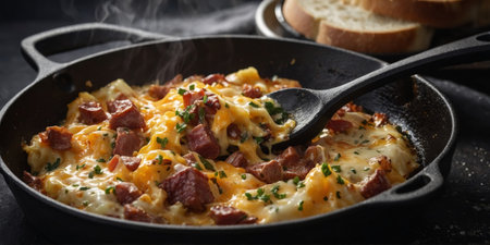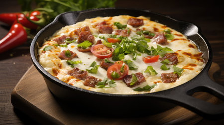 AI Generated. A cast iron pan holds a bubbling concoction of melted cheese and savory meats perfect for dipping freshly toasted bread into
