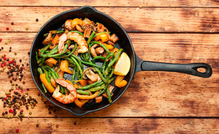Salad with atlantic shrimps and asparagus beans. Stew with seafood and vegetables.