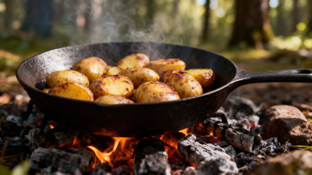 Golden potatoes sizzle in a cast iron skillet over a crackling campfire, creating a rustic and inviting outdoor cooking scene. The forest provides a natural backdrop.
