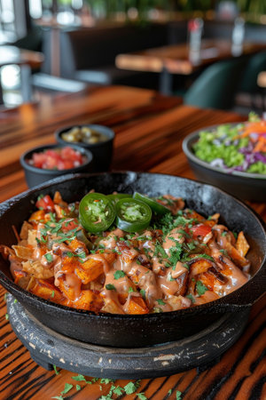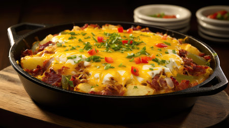 Delicious Comfort Food Cast Iron Skillet with Savory Sweet Potato Fries, Toppings, and Fresh Herbs