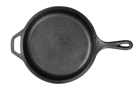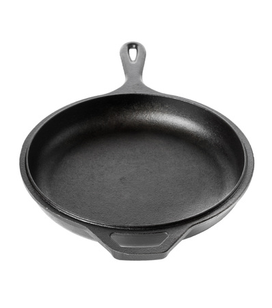 Empty, clean black cast iron pan or dutch oven top view from above over white background