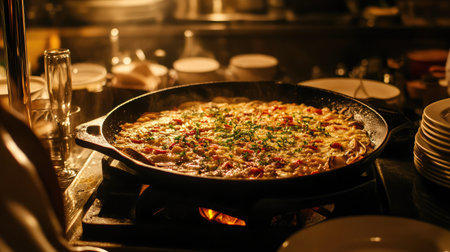 A beautifully prepared paella simmers on a stove in a bustling restaurant kitchen, showcasing vibrant colors and fresh ingredients that tantalize the senses.