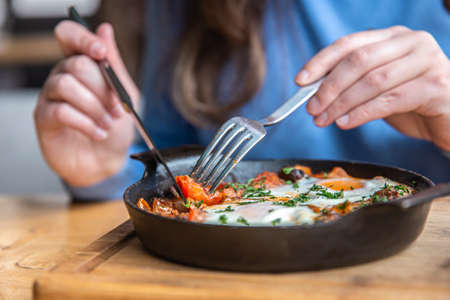 Close-up, a woman in a cafe dines on traditional shakshuka.