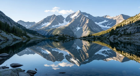Minimalist sunny mountain landscape with snow-covered mountain top in golden sunshine in clear blue sky. Minimal alpine scenery with high snowy pinnacle in sunlight. Snow on sharp rocks on pointy peak