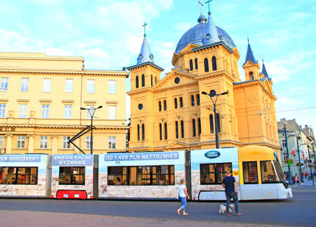 Modern tram going on street of Lodz. Popular touristic attraction and destination. Colored tramway going along city. Modern passenger transportation