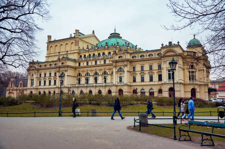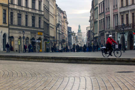 Krakow, Poland - March 24, 2019: Street with historical houses in Krakow old town