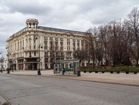 Warsaw/Poland. Streets of capital during coronavirus pandemic, usually very crowded with people or cars, now empty. Nowy Swiat street, Bristol Hotel and one person on the bus stop.