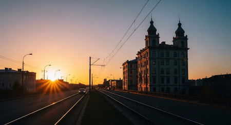Sunset in the city with traffic. architecture silhouettes of Europe. Landscape of city. Landscape Europe